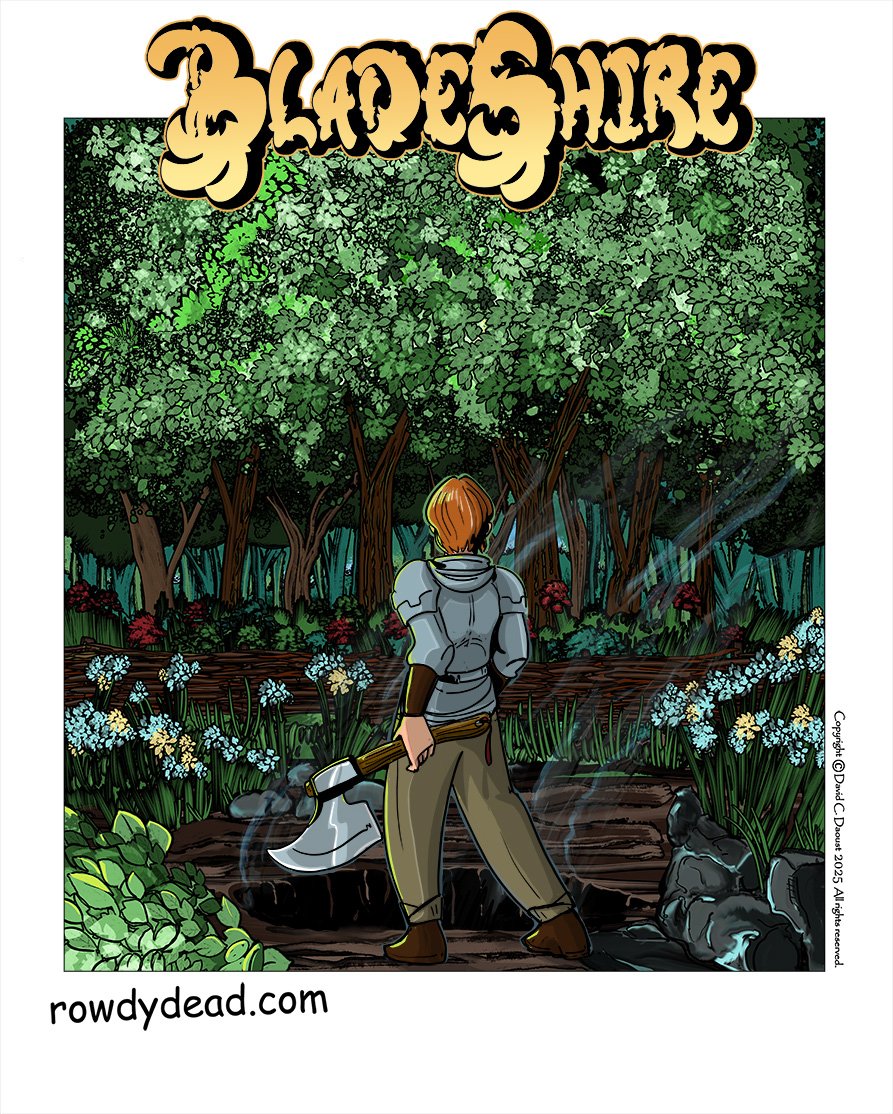 The Collier’s Yard was a misshapen mess of uneven ground and stacked piles of wood. Years of being used for pit fires had left small hilly bumps and mounds throughout. Much of it was charred, some of which was black as pitch. Impressive tufts of wild growth managed to reclaim some areas, others… just mud waiting to happen. Old wood fence-work wrapped the far side of the land, holding back the brush. Towering trees beyond. The wattle fence around the perimeter matched the old pigsty behind Old’Hindal’s cottage; all of it made of flexible branches, bent between upright stakes. A covered area created a shelter for the animal. Notably, there was no pig within. Between the pigpen and the cottage, was a tool shed.