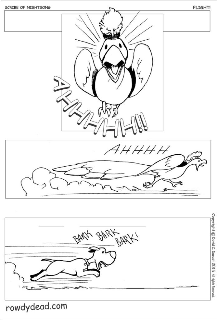 Peacocks actually fly a bit better than I thought when I drew this. They just don’t fly very high or for very long. I was picturing like a chicken flapping about when scared, but peacocks can get some distance. I almost changed this, but that middle panel cracked me up.