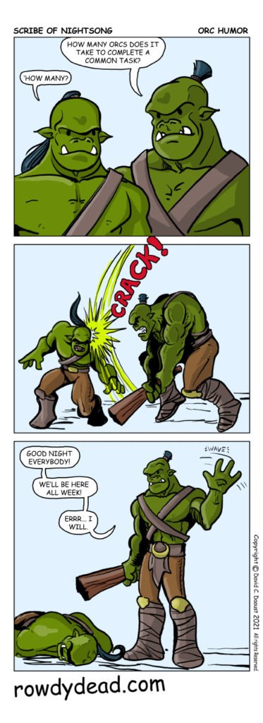 Scribe 284September 29, 2021 Home Comics Orc Camp Scribe 284 << First < Prev Next > Last >> Share to: Click to share on Facebook (Opens in new window) Facebook Click to share on X (Opens in new window) X Tags# One dead Orc# One funny Orc