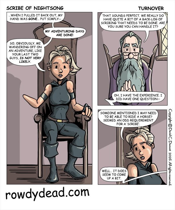 The Scribe of Nightsong– on Wednesday! Presented by Rowdydead Productions– Webcomics and serialized fiction. Stop by the site to read our comics and stories. You know, if you want.